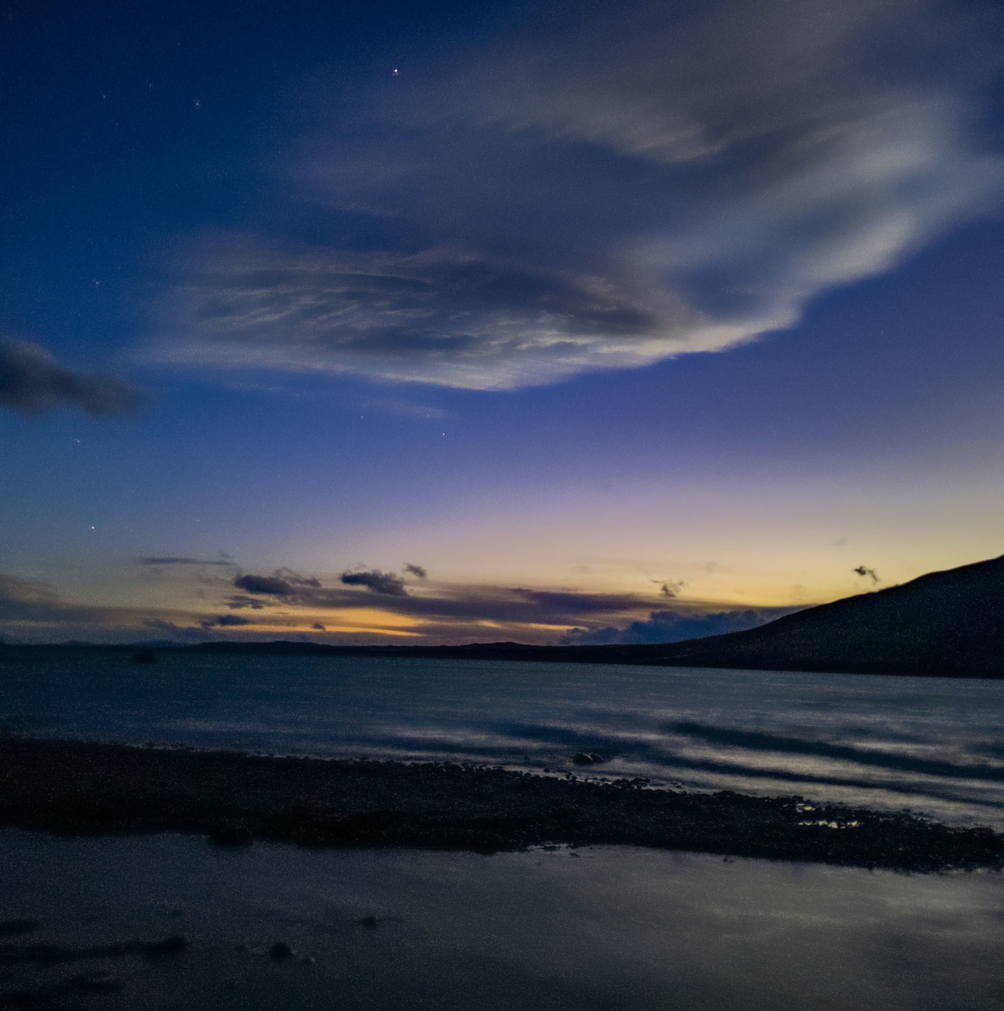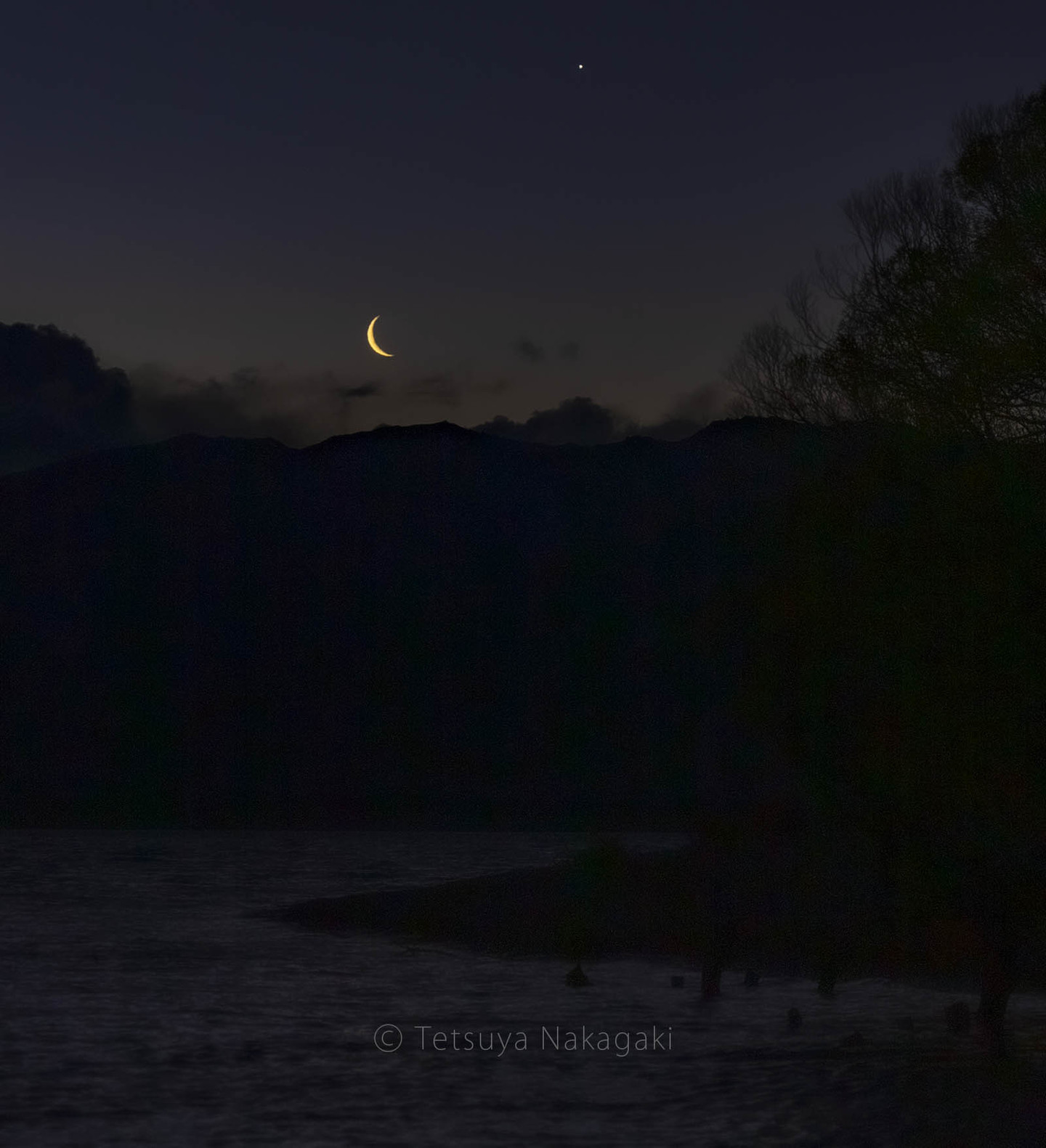 湖の対岸に湖畔の街明かりが見えます