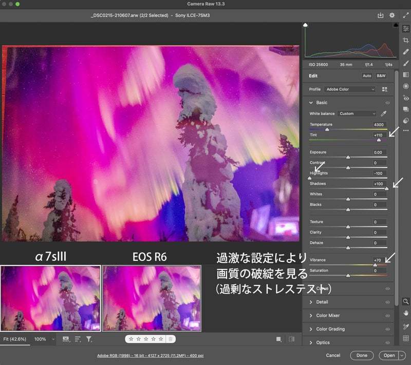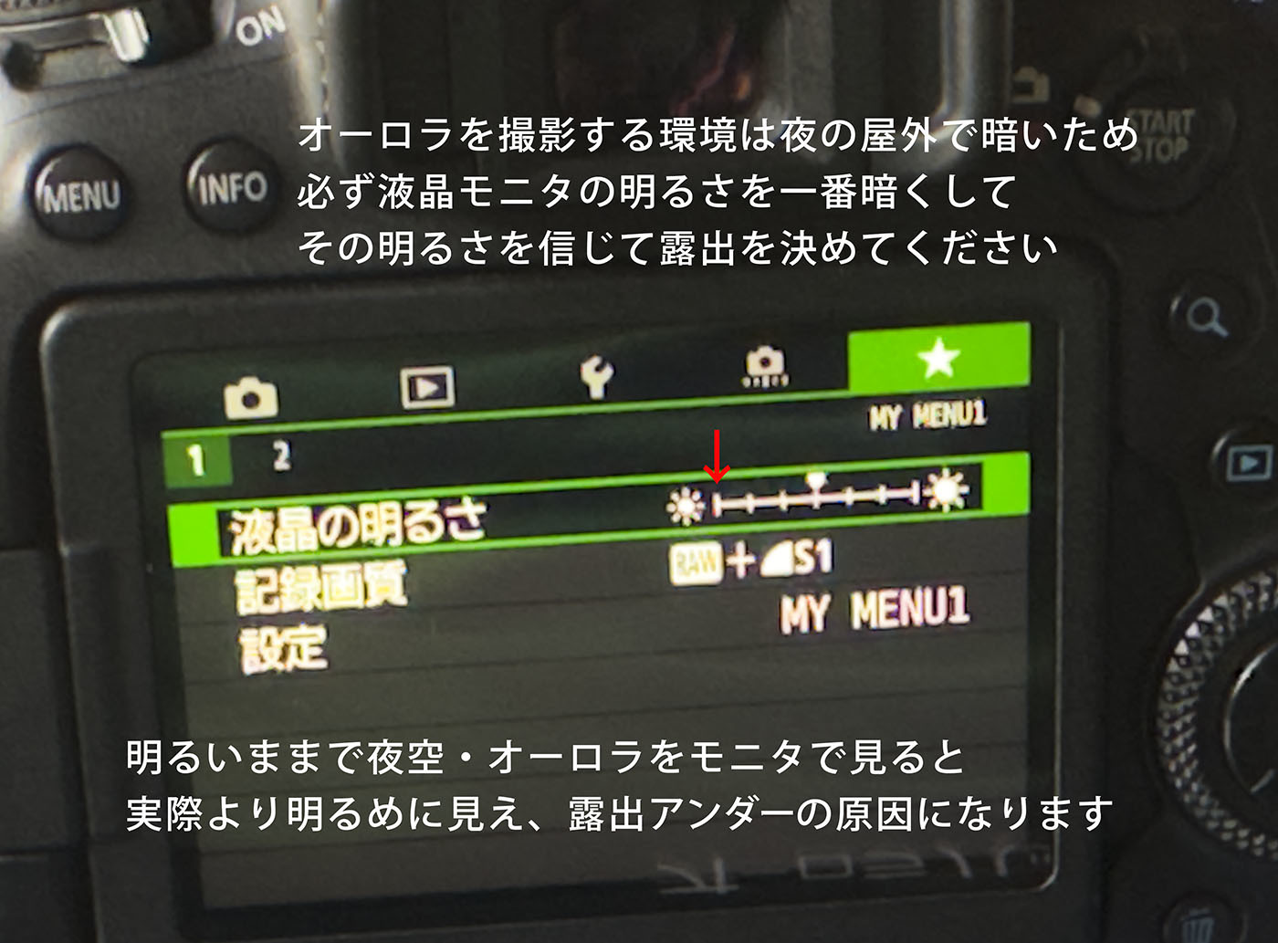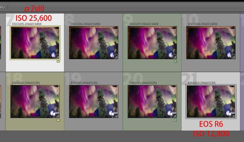 オーロラの撮影はRAWデータで記録し、適正な現像処理することでコントラストの良いきれいな写真に改善します
