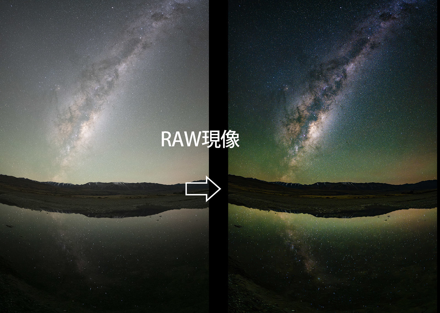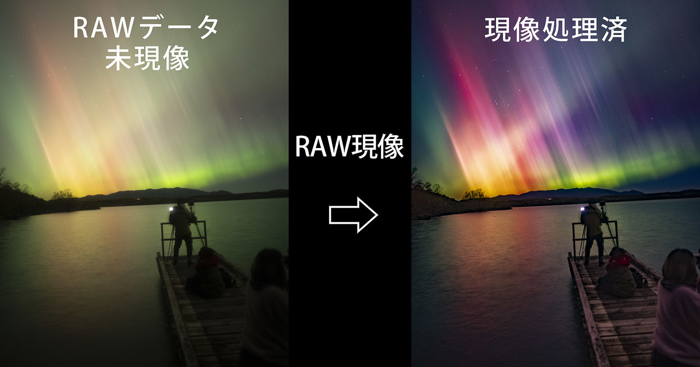 jpgなどの圧縮データは、カメラが自動で決めた現像処理による画像で、日中などのバランスの良い光源の下では良好な写真をつくってくれます。また夜空は太陽光がありませんので、光源が微妙です。特にオーロラは特殊な発光体であり、カメラが自動現像では不十分です。熟練者がRAWデータを元に現像処理することにより理想的な画像をつくることができます。