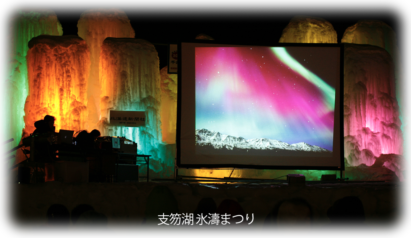 支笏湖の氷濤まつりにて、氷のライトアップをバックにオーロラ上映