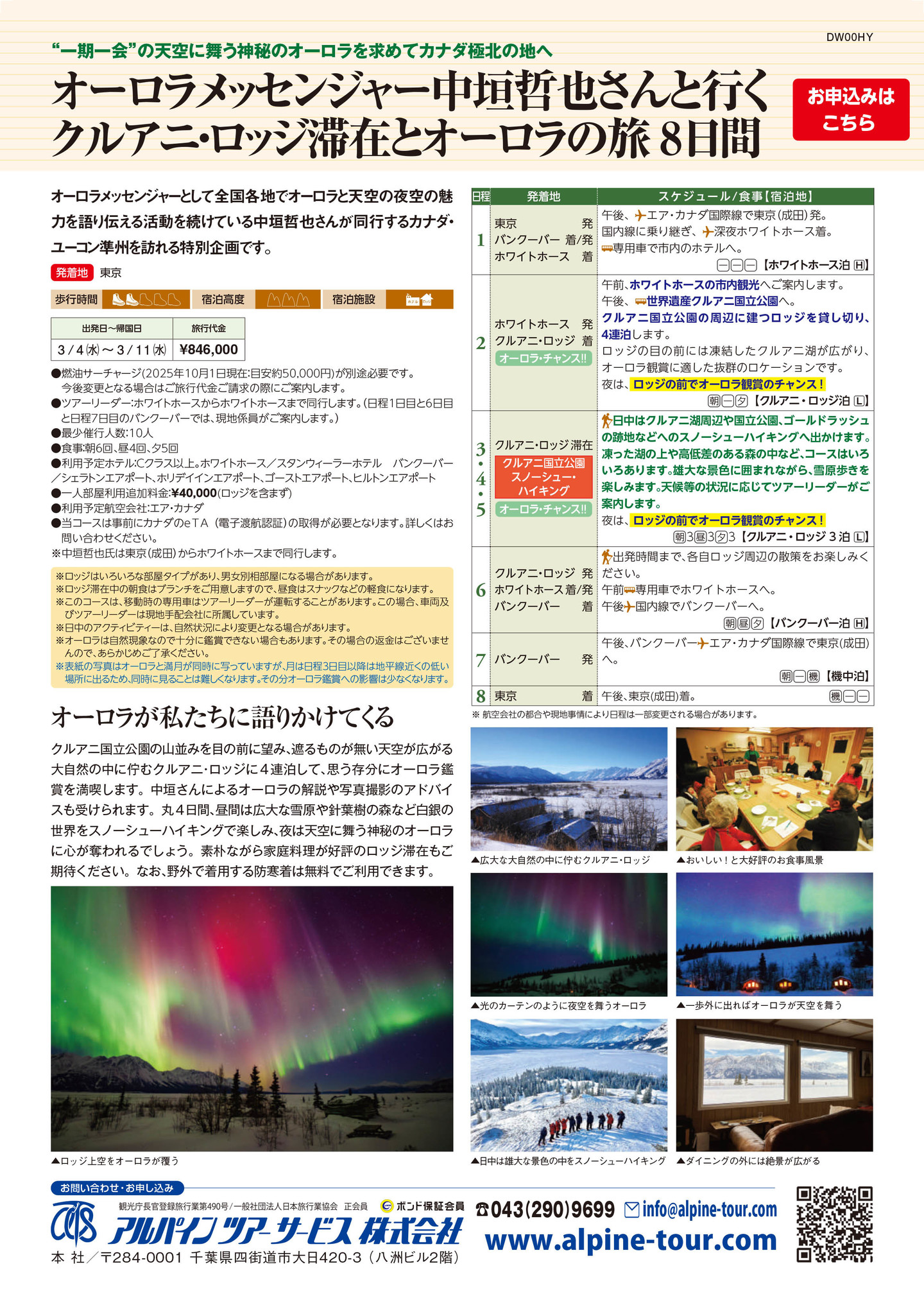 クルアニ・ロッジ滞在とオーロラの旅 9日間