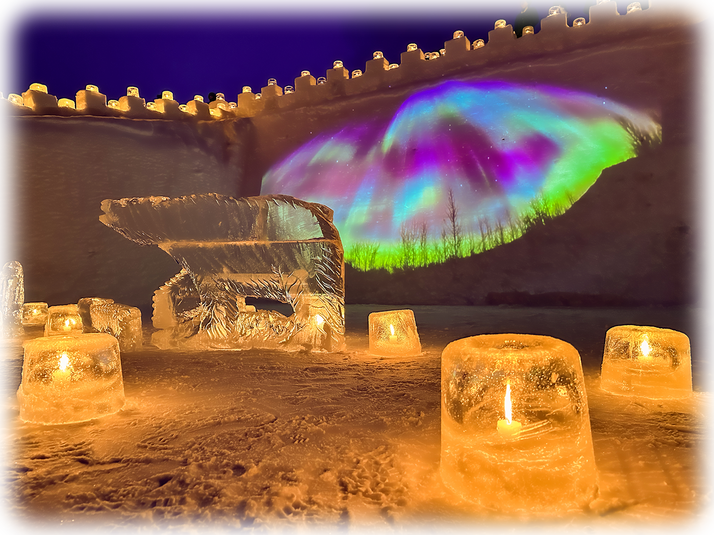 支笏湖の氷濤まつりにて、氷のライトアップをバックにオーロラ上映